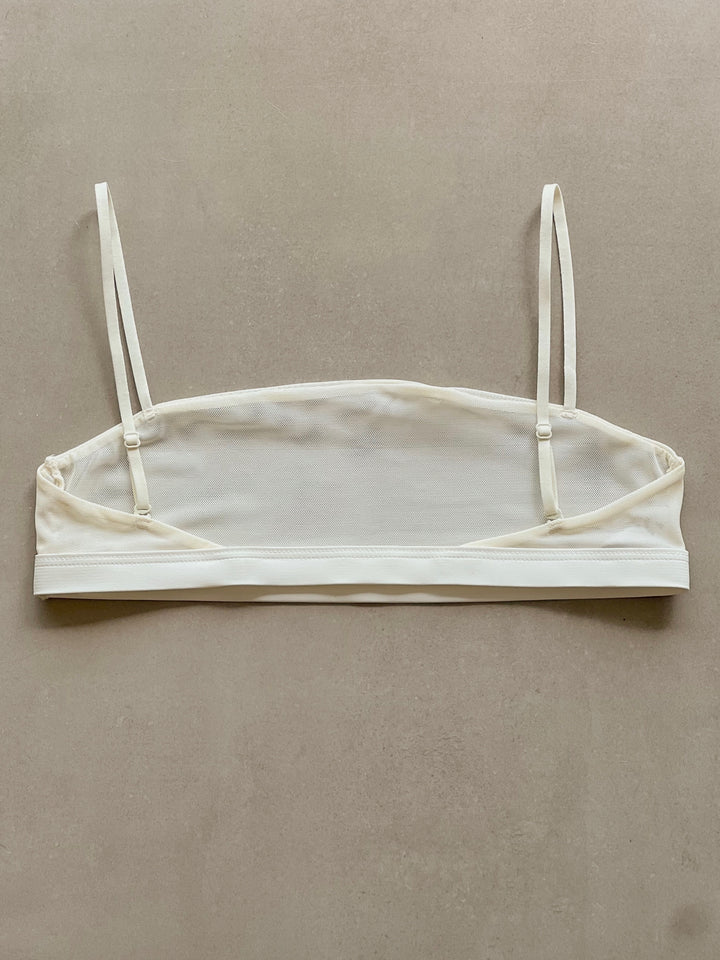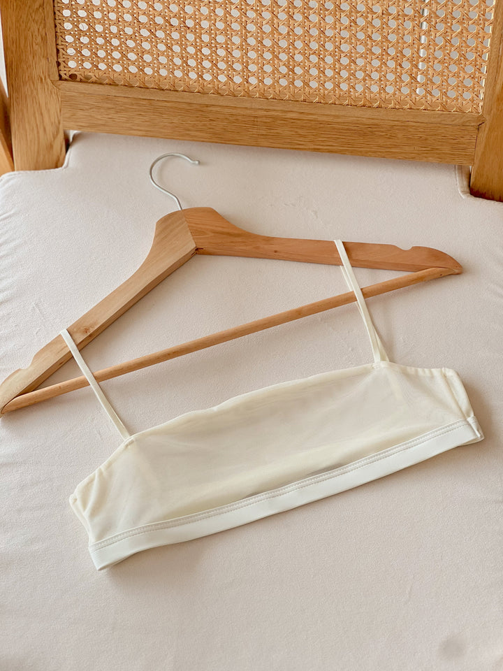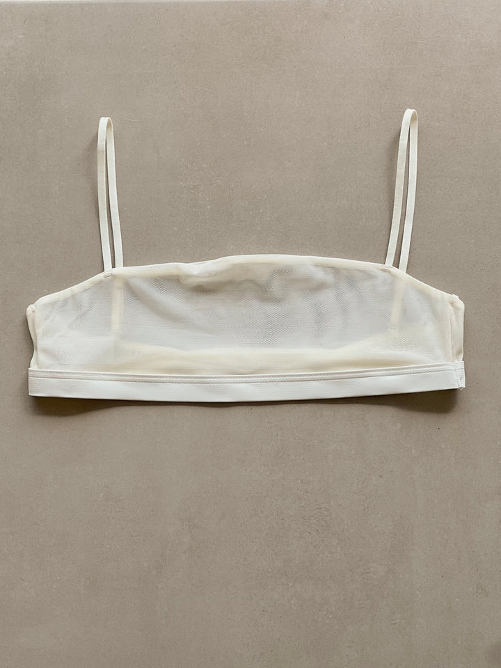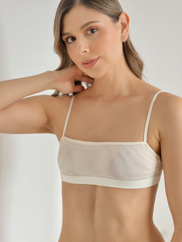 Top elaborado completamente en tul doble. Su silueta de escote recto, cargaderas tiny y diseño en espalda, lo hacen la prenda ideal para adaptar a camisas o vestidos que lo requieran. Es una prenda funcional y, a la vez muy sensual.