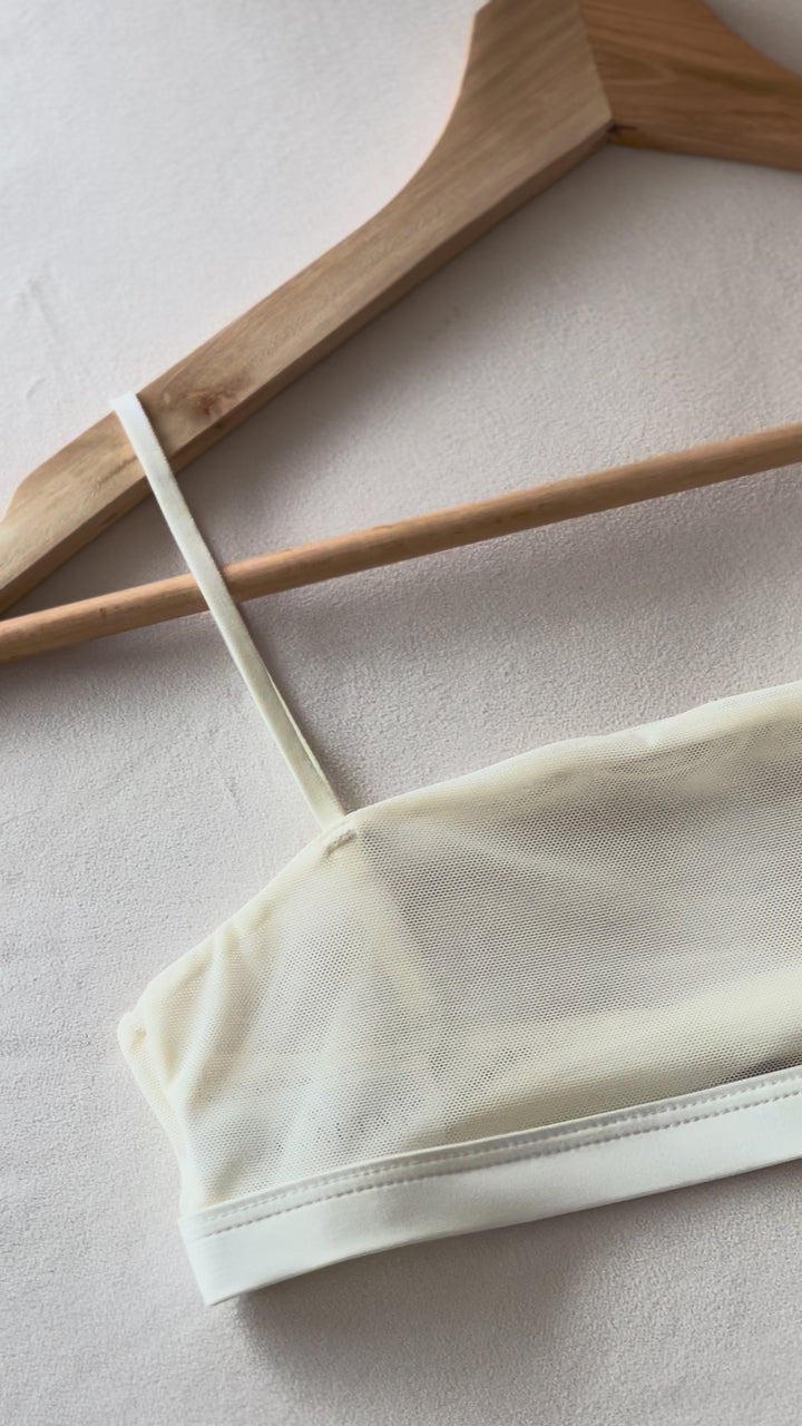 Top elaborado completamente en tul doble. Su silueta de escote recto, cargaderas tiny y diseño en espalda, lo hacen la prenda ideal para adaptar a camisas o vestidos que lo requieran. Es una prenda funcional y, a la vez muy sensual.